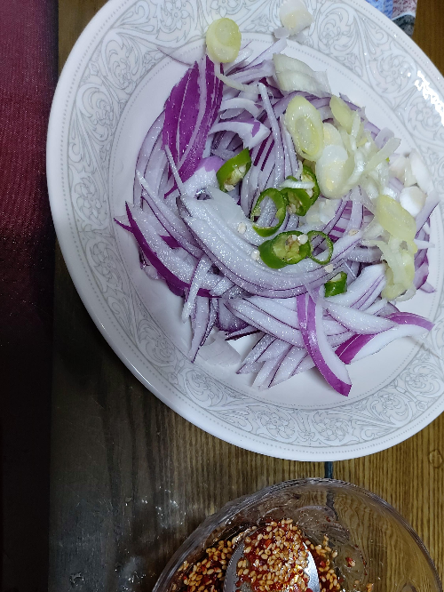 자색양파밖에 없어서 채썰어 물에 담갔다가 건졌음.