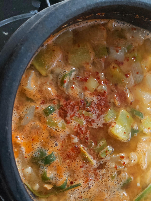 무 혹은 양파, 호박 혹은 두부, 파, 청양고추 2개, 맛나 약간. 고춧가루는 다 끓은 후에 ~~