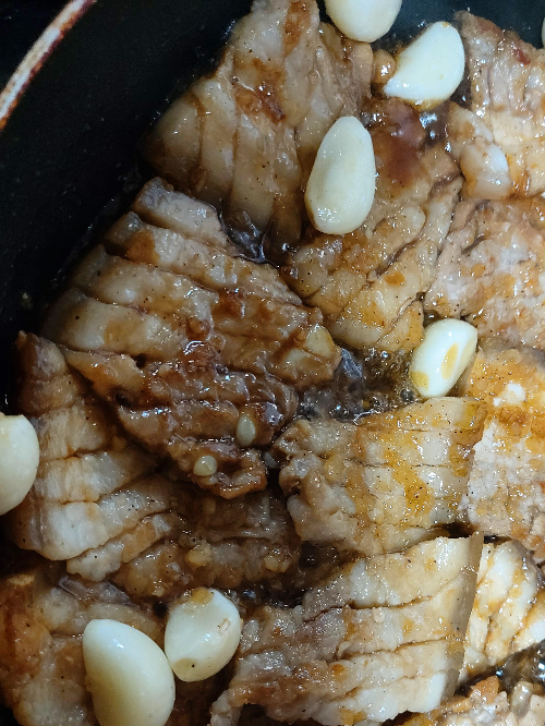 오늘은 수육 말고 두껍게 썰은 벌집삼겹살과 된장찌개를 끓이고 파절이 대신 양파를 간장에 절여 한 끼 해결합니다.