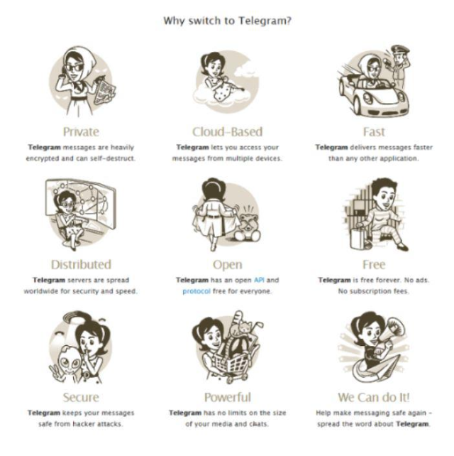 푸른색 하늘에 하얀 종이 비행기를 로고로 하고 있는 텔레그램은 기본적인 텍스트 형식의 메시지 외에도 사진이나 동영상을 비롯한 파일(doc, zip, mp3 등)까지 전송할 수 있다. 또 광고가 전혀 없어 가볍고 빠르게 메시지를 주고받을 수 있다는 장점이 있다. 아울러 최대 200명과 그룹 채팅이 가능하고, 단체 메시지 리스트 기능을 이용해 최대 100명에게 한번에 메시지를 보낼 수 있다. 이 밖에 대화에 암호를 설정할 수 있고, 자신이 받거나 보낸 메시지가 서버에 저장되지 않도록 삭제할 수 있는 등 보안성이 뛰어나다. 실제로 텔레그램은 정기적으로 수억 원의 상금을 내건 해킹 콘테스트를 실시하고 있으나, 아직까지 암호를 푼 사람이 없을 정도로 강력한 보안체계를 갖추고 있다.