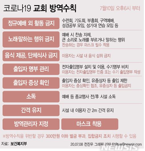 "교회 책임·종사자는 음식 제공과 단체 식사를 제공해서는 안 된다. QR 코드 기반 전자출입 명부 또는 수기 출입 명부를 비치해야 하고, 증상을 확인하며 방역관리자를 지정해야 한다. 예배 전후에는 시설을 소독해야 한다. 마스크를 껴야 하고, 이용자 간 최소 1미터(m) 거리두기를 지켜야 하는 것은 물론이다.