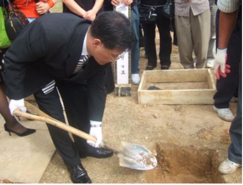 * 하관 - 장지에 도착하면 묘역을 살피고 곧 하관 하며 하관 후 명정을 영구 위에 펴고 횡대를 덮고 회격하고 평토 하며 준비한 지석을 오른편 아래쪽에 묻고 성분 한다.