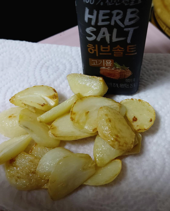 그러니 생선은 주로 흰살 생선으로 조기, 칼치, 가자미 정도... 오늘은 임연수어를 튀기려다가 마늘을 구워서 임연수 위에 토핑했습니다. 따로 양념은 하지 않았구요. 아침 식사는 늘 스피드 음식을 만들기 때문에 대충대충합니다. 그래도 맛있어요. 와사비 간장을 심심하게 만들어서 찍어먹으면 됩니다.
