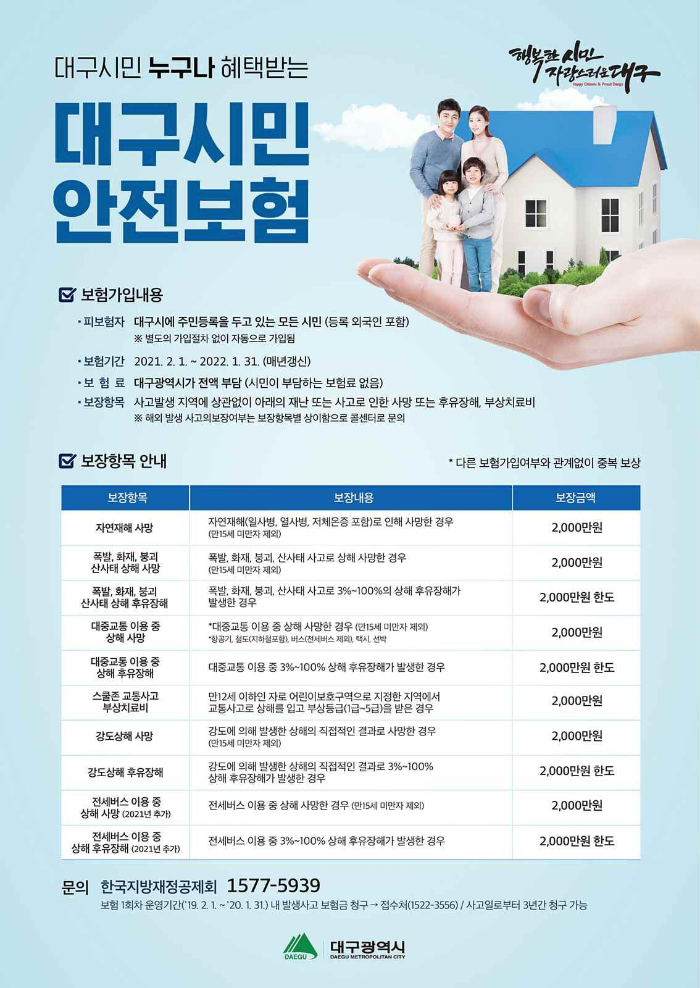 대구 시민안전보험은 대구에 주민등록을 두고 있는 시민이면 별도 보험료 부담이나 가입절차 없이 자동으로 보험에 가입되고 각종 재난과 사고 등으로 후유장해를 입거나 사망하면 최대 2천만원 보험금을 지급하는 제도입니다.