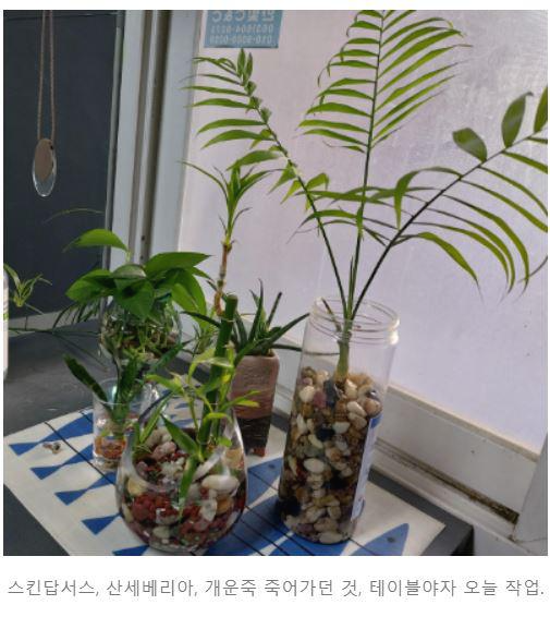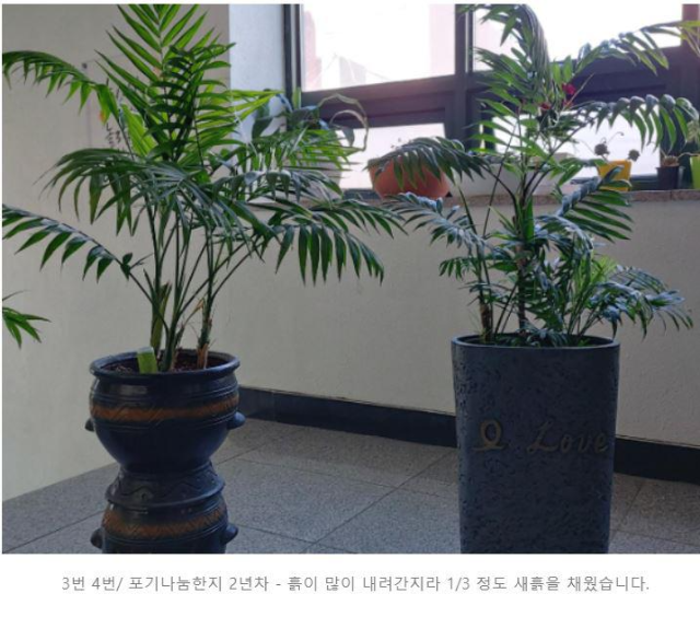 어쩌다보니 테이블야자가 선물 받은 2개에서 5~6개까지 식구가 불어났습니다. 그저 분갈이할 때마다 포기를 나누어서 옮겨 심고 물에 담가 수경으로 키우고 하다 보니 이렇게 되었네요. 그러고 보니 테이블야자가 저 같은 사람도 거의 실패하지 않는 것을 보니 초보자에게는 키우기 쉬운 고마운 식물이 되겠습니다.