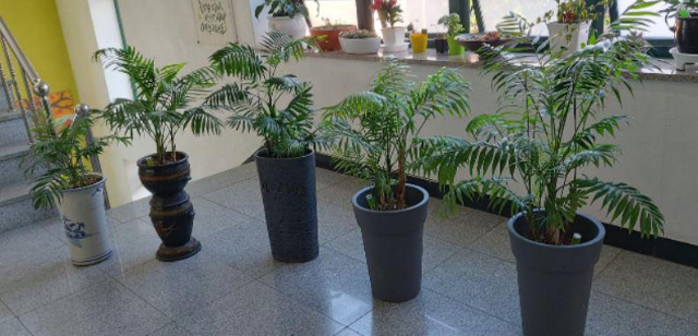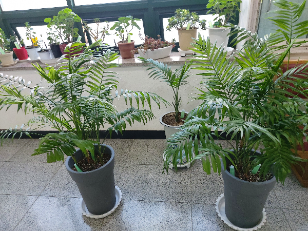 2년이 지난 23년 3월말 테이블야자의 모습입니다. 위에 강단에 있던 두 아이의 모습과 그 외에 수경으로 뿌리 내린 아이도 자리를 잘 잡아서 크고 있고 윗 층에도 있는데 이 아이들만 사진 찍었습니다. 분갈이는 못했고 흙갈이 복토만 해 주었습니다. 알갱이 비료 가끔씩 얹어주었고 봄 여름 가을 비오는 날은 비를 맞게 해주었지요.
