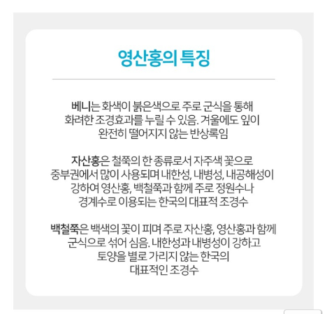 특히 영산홍은 겨울에도 잎이 떨어지지 않는다고 하니 저 같은 초보 정원수에 적합하지 않을까 싶어요.
