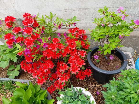 같은 날 같은 묘목을 심었는데 분홍색은 모두 활짝 피었다가 지는데 빨강색은 이제 막 피기 시작했어요.