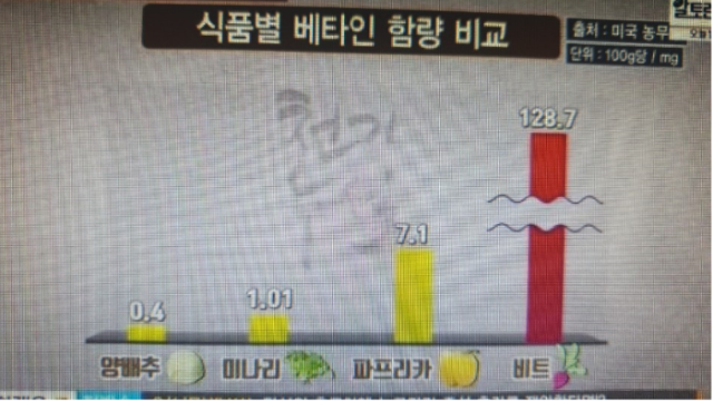 베타카로틴이 가장 많이 가장 많이 함유된 비트를 비롯해 흔히 우리가 알고 있는 영양 채소들을 평소에 잘 챙겨 먹어야겠다.
