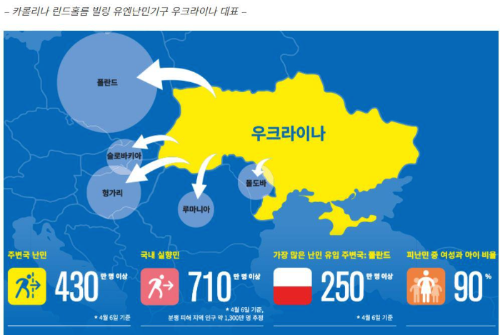 지난 2월 24일 러시아의 군사 행동이 시작된 지 한 달 반이 지난 현재, 430만 명 이상이 폴란드, 몰도바, 헝가리 등 주변국으로 피난했고, 710만 명 이상은 우크라이나 내 다른 지역으로 피난했습니다. 인구의 약 25%가 살던 곳을 잃고 피난길에 올랐습니다. 약 13만 명은 체르니히우(Chernihiv), 하르키우(Kharkiv), 마리우폴(Mariupol) 등 큰 피해 지역에 고립되어 있습니다.
